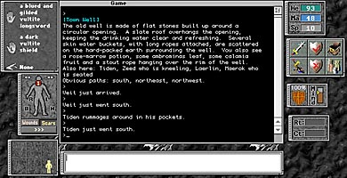 ![]() The Gemstone interface, with game window at center, typing window at bottom, and status icons to either side. |