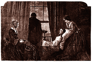 subject in bed--or possibly on the parlor sofa--with one or more people in attendance.