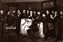 The perceived need to do this resulted in the creation of formulas by which these scenes were depicted, and which were rarely varied except in minor detail. This can be easily demonstrated by comparing lithographs that depict the deaths of American Presidents. Each scene is essentially the same. The dying man is seen in his last moments, surrounded by members of his Cabinet and other people with whom he had been associated. It mattered little whether these people were actually present, or if they were, whether they were present at the same time. It was important, however, that their association with the dying man be maintained within the context of the print.