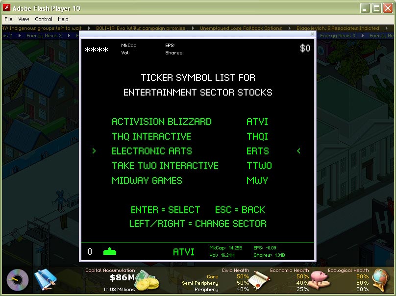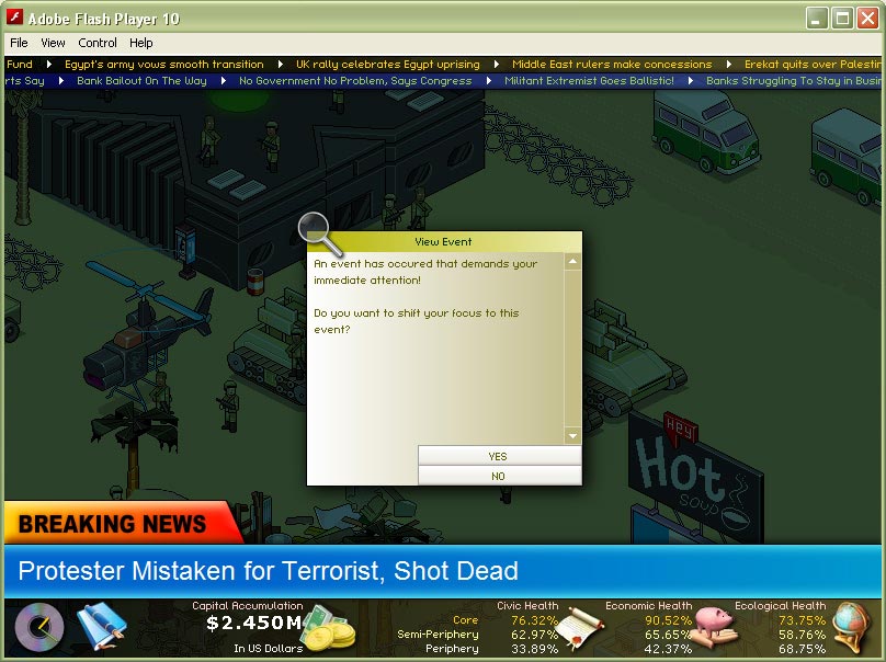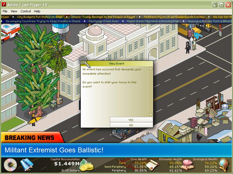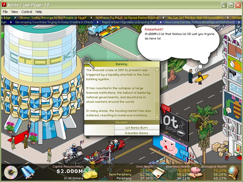 - Game engine supports both in-game generated news and world news streamed in from external feeds